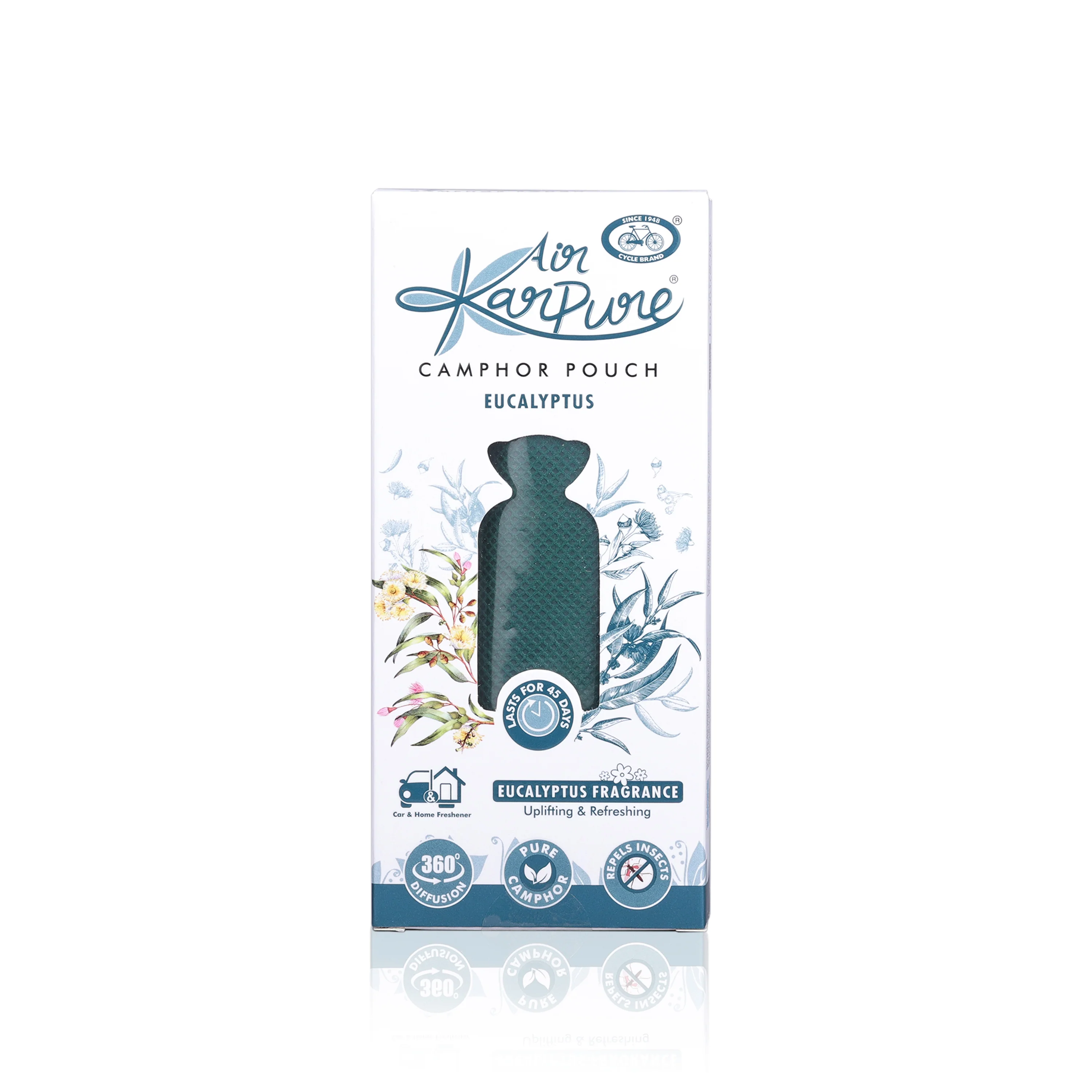 Experience the crisp, uplifting fragrance of Air Karpure Eucalyptus Camphor Pouch. This fragrance pouch blends pure camphor with the refreshing notes of eucalyptus, creating a powerful fragrance that freshens the air in your storage spaces, closets, wardrobes, cars, bathrooms, home, and office. Â