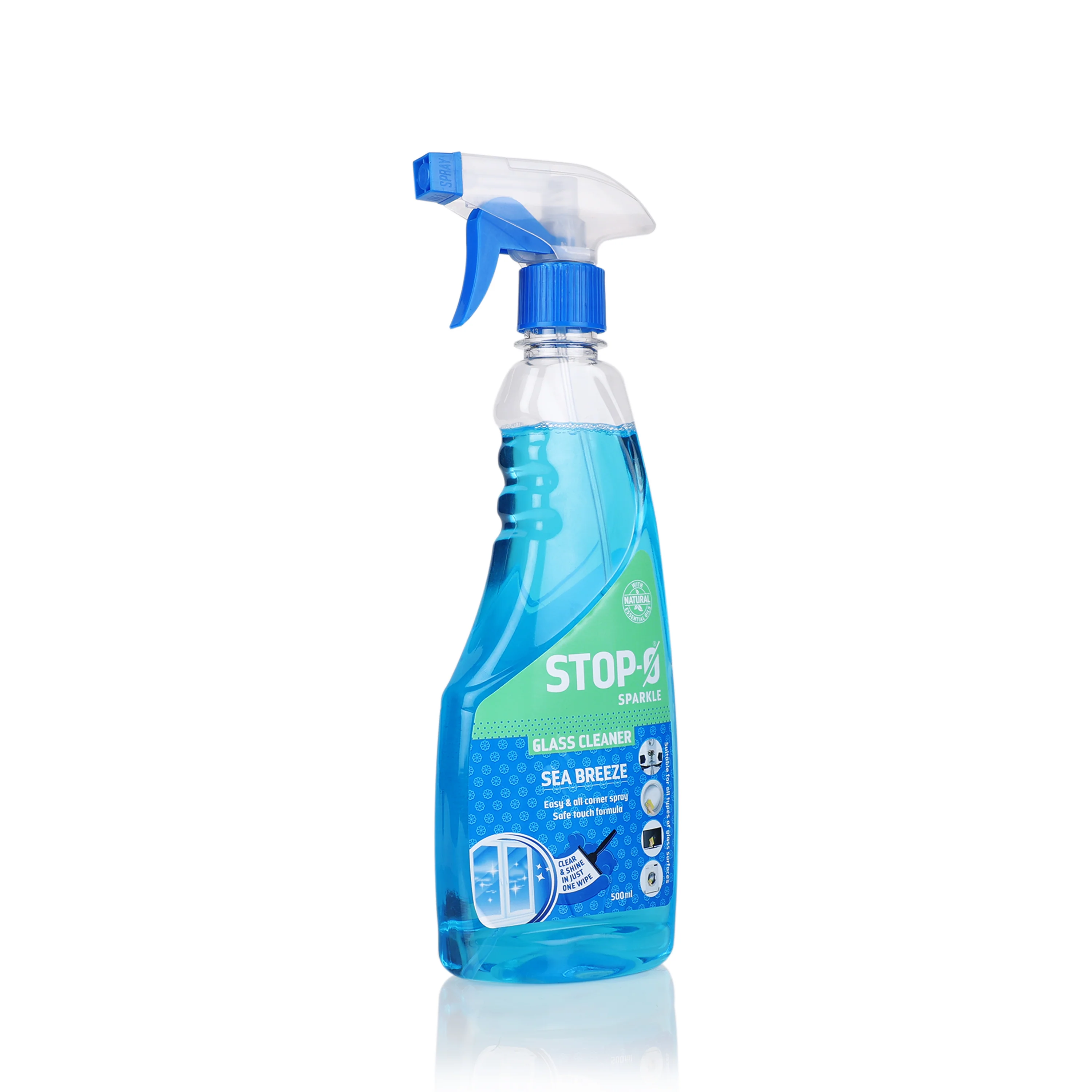 Stop-O Protect Glass Cleaner Liquid removes dust, dirt, sweat stains and finger prints from your glass surfaces, leaving them clean and shiny in just one wipe. This is a 500 ml pack infused with fresh Sea Breeze fragrance.